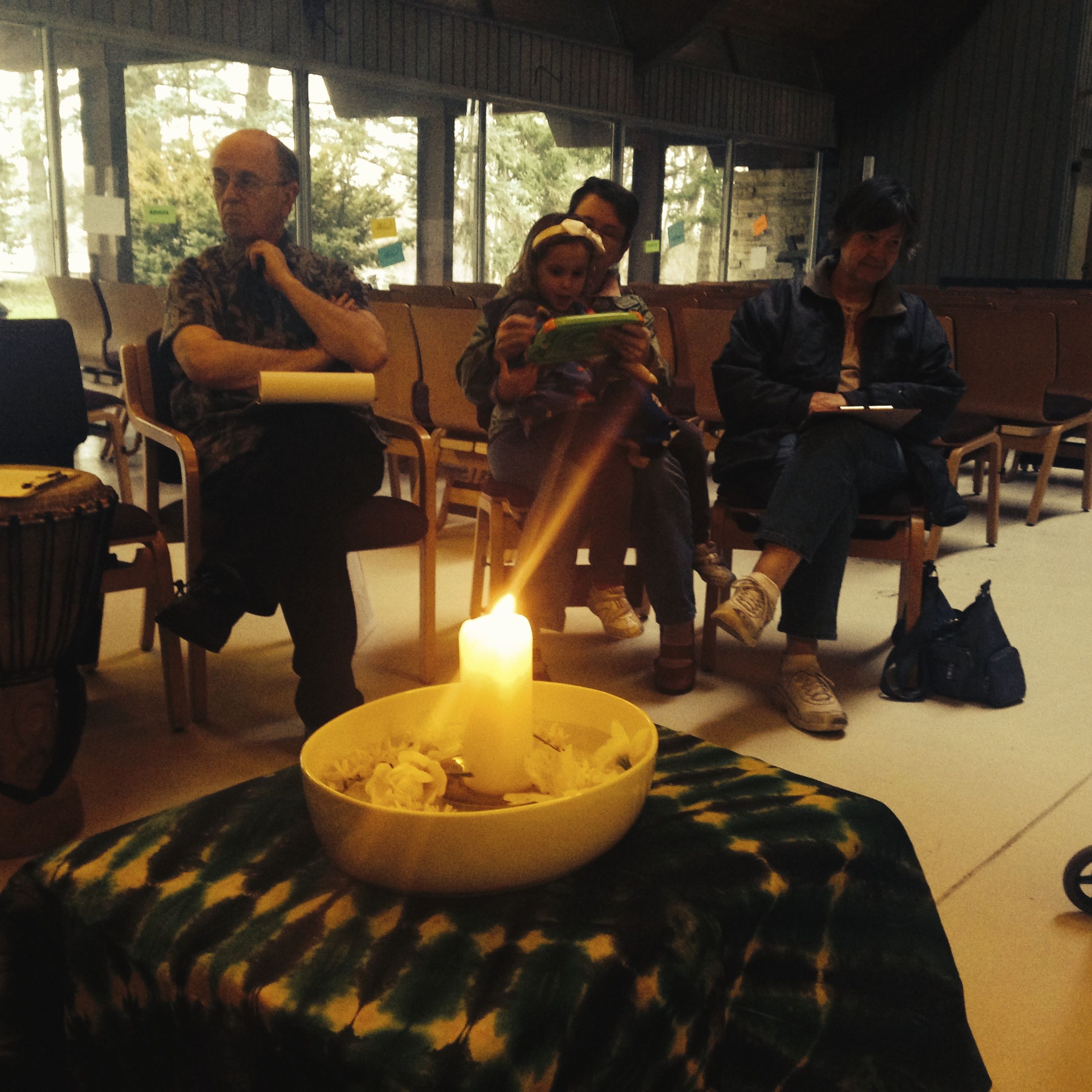 Come at 5:30. If you come a little earlier, you can help set up and get acquainted before we begin. We gather with singing and introductions, then sit together in a circle of chairs in our worship space.